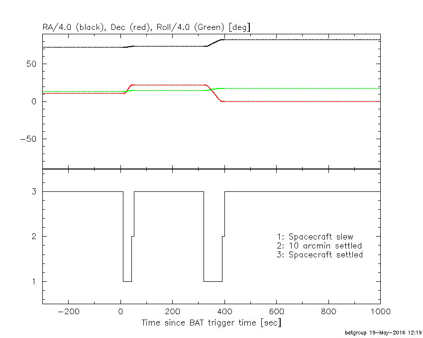 - 5) The verticle lines correspond to following: green dotted lines are T50 interval, black dotted lines are T90 interval, blue solid line(s) is a spacecraft slew start time, and orange solid line(s) is a spacecraft slew end time.