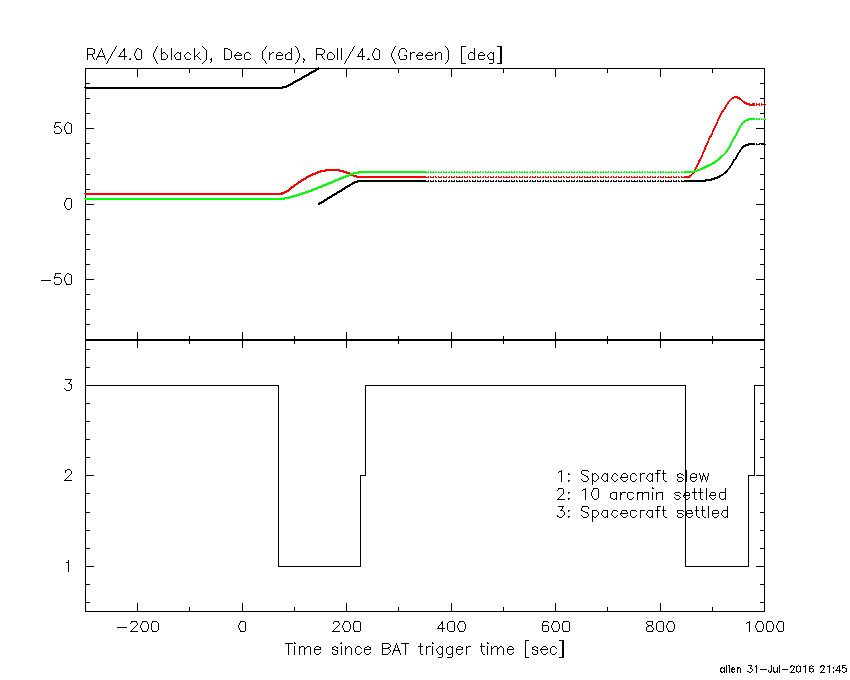 - 4) The verticle lines correspond to following: green dotted lines are T50 interval, black dotted lines are T90 interval, blue solid line(s) is a spacecraft slew start time, and orange solid line(s) is a spacecraft slew end time.