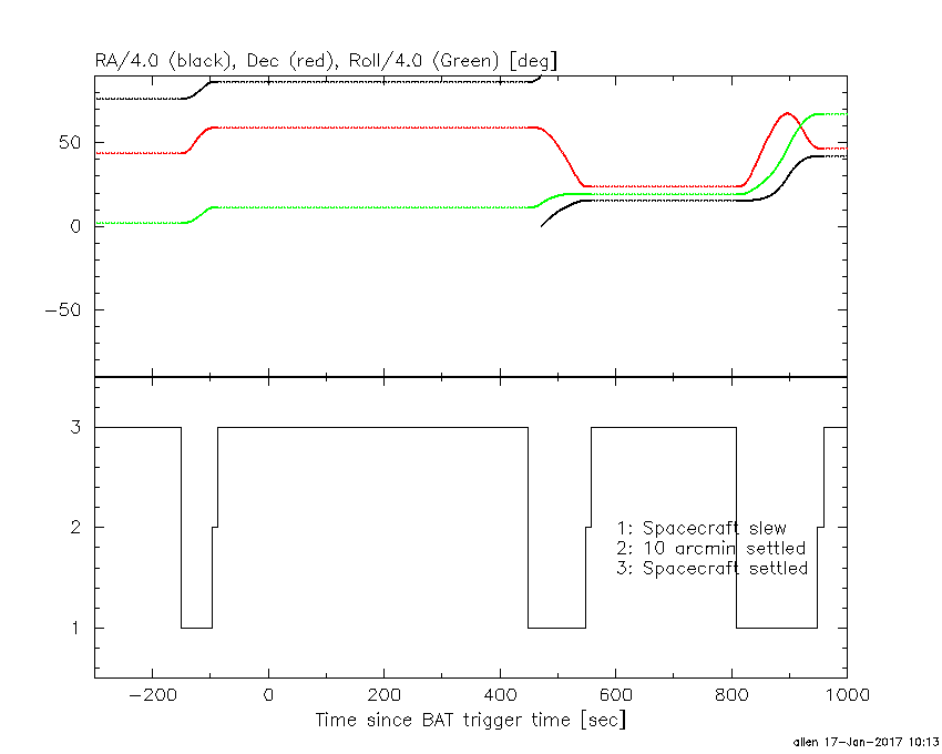 - 5) The verticle lines correspond to following: green dotted lines are T50 interval, black dotted lines are T90 interval, blue solid line(s) is a spacecraft slew start time, and orange solid line(s) is a spacecraft slew end time.