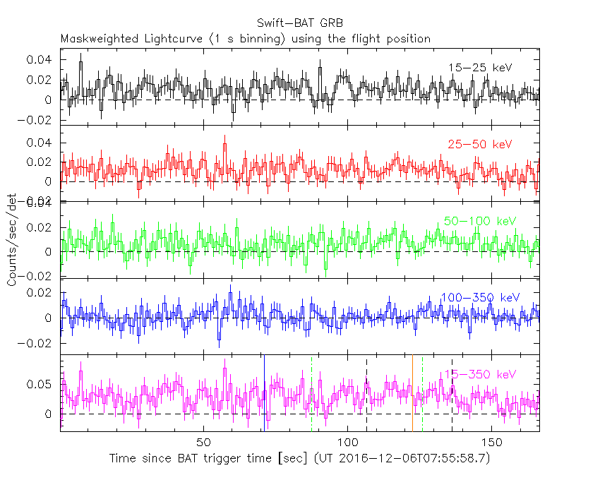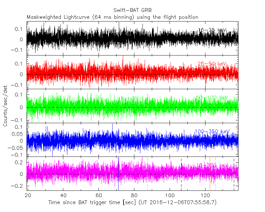 - 5) The verticle lines correspond to following: green dotted lines are T50 interval, black dotted lines are T90 interval, blue solid line(s) is a spacecraft slew start time, and orange solid line(s) is a spacecraft slew end time.