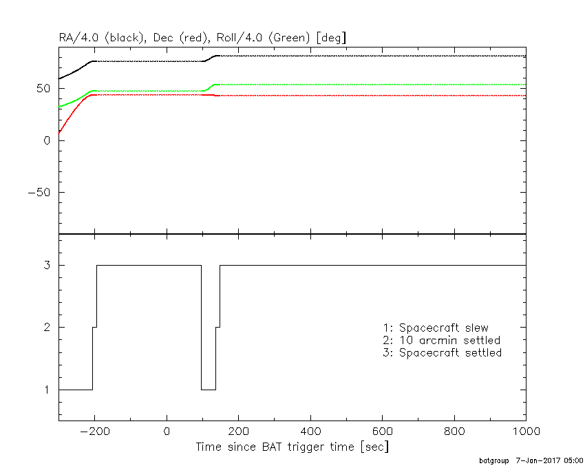 - 5) The verticle lines correspond to following: green dotted lines are T50 interval, black dotted lines are T90 interval, blue solid line(s) is a spacecraft slew start time, and orange solid line(s) is a spacecraft slew end time.