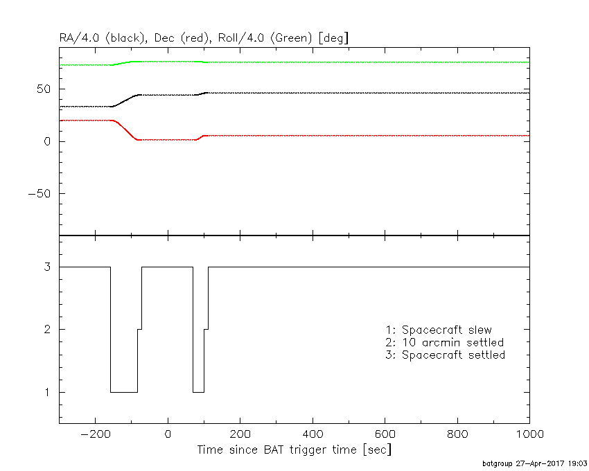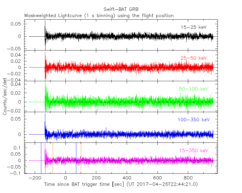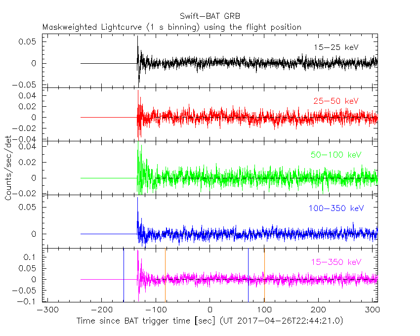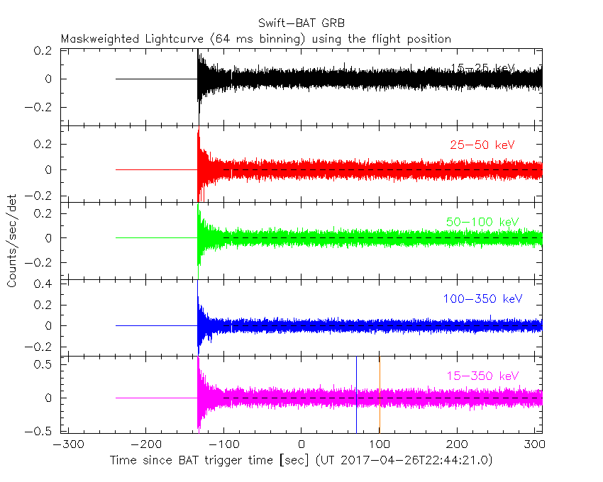 - 5) The verticle lines correspond to following: green dotted lines are T50 interval, black dotted lines are T90 interval, blue solid line(s) is a spacecraft slew start time, and orange solid line(s) is a spacecraft slew end time.