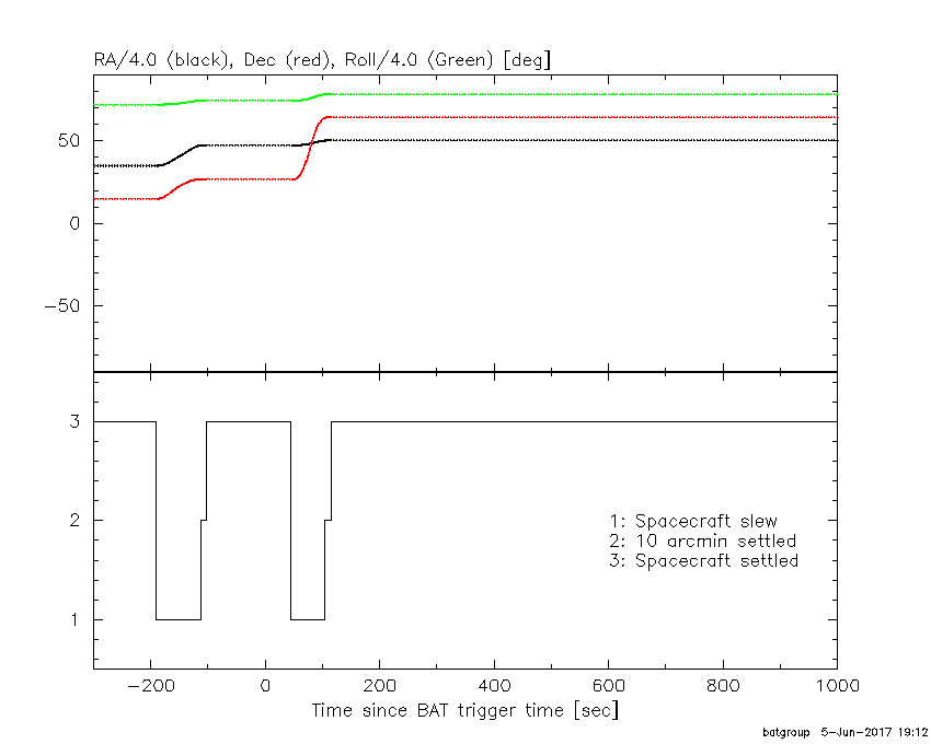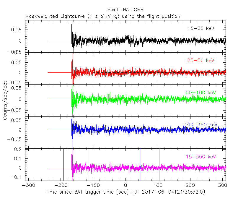 - 5) The verticle lines correspond to following: green dotted lines are T50 interval, black dotted lines are T90 interval, blue solid line(s) is a spacecraft slew start time, and orange solid line(s) is a spacecraft slew end time.