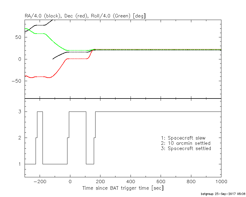 - 5) The verticle lines correspond to following: green dotted lines are T50 interval, black dotted lines are T90 interval, blue solid line(s) is a spacecraft slew start time, and orange solid line(s) is a spacecraft slew end time.