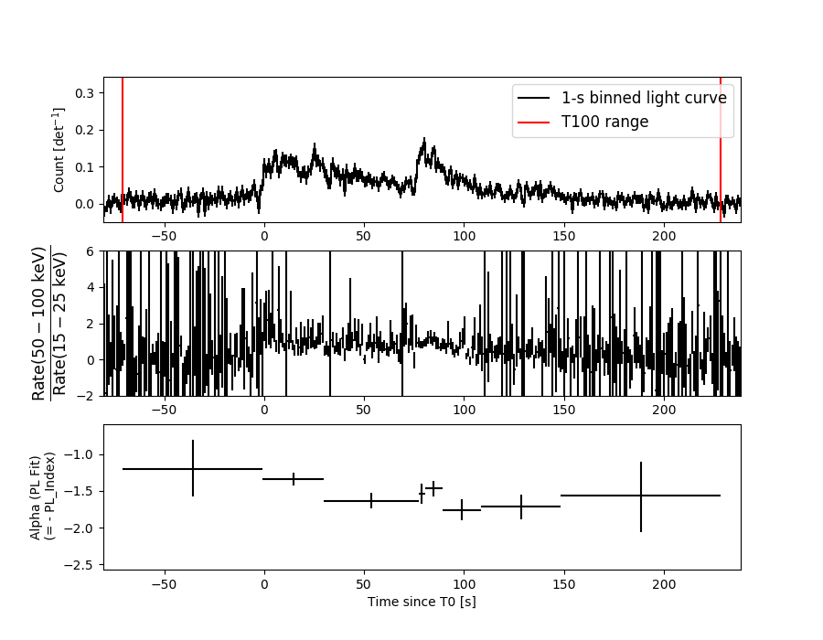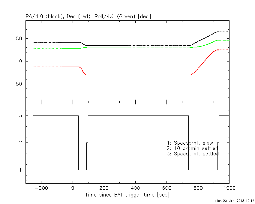 - 4) The verticle lines correspond to following: green dotted lines are T50 interval, black dotted lines are T90 interval, blue solid line(s) is a spacecraft slew start time, and orange solid line(s) is a spacecraft slew end time.