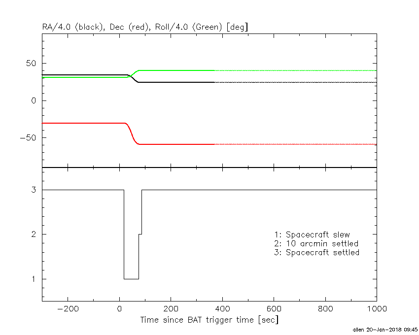 - 4) The verticle lines correspond to following: green dotted lines are T50 interval, black dotted lines are T90 interval, blue solid line(s) is a spacecraft slew start time, and orange solid line(s) is a spacecraft slew end time.