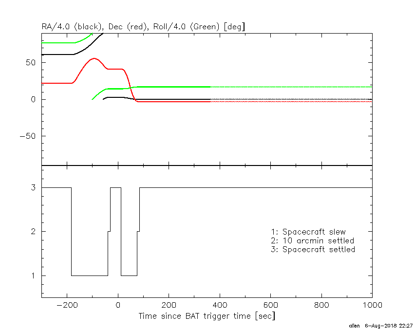 - 4) The verticle lines correspond to following: green dotted lines are T50 interval, black dotted lines are T90 interval, blue solid line(s) is a spacecraft slew start time, and orange solid line(s) is a spacecraft slew end time.