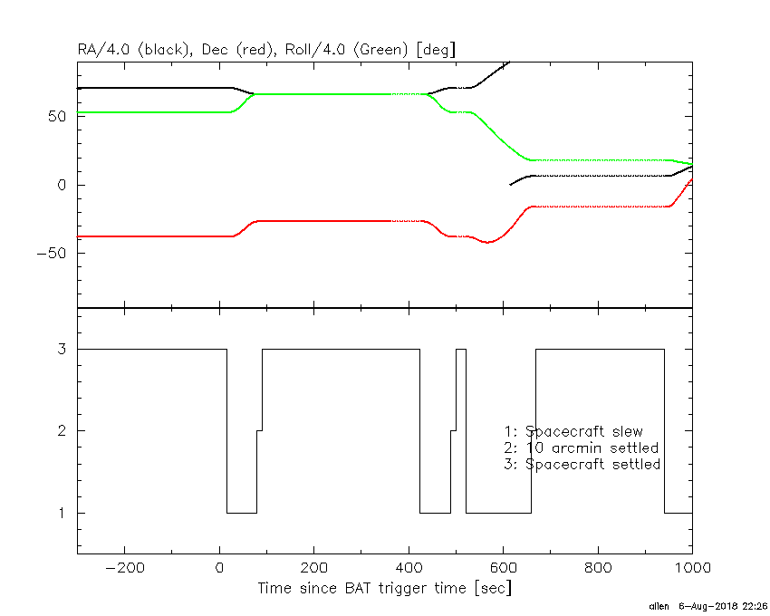 - 4) The verticle lines correspond to following: green dotted lines are T50 interval, black dotted lines are T90 interval, blue solid line(s) is a spacecraft slew start time, and orange solid line(s) is a spacecraft slew end time.
