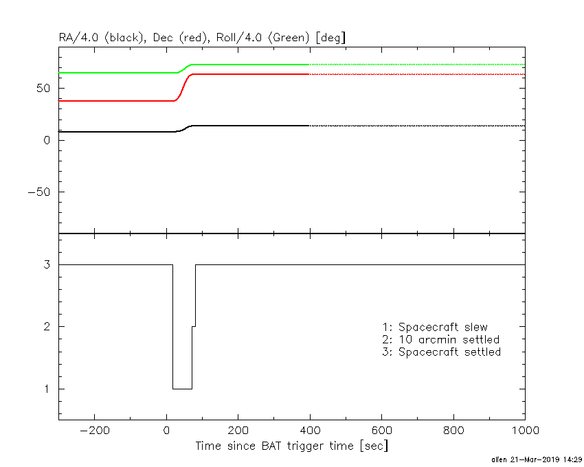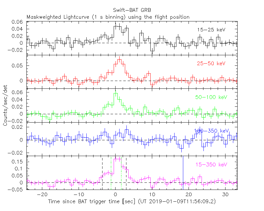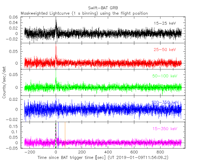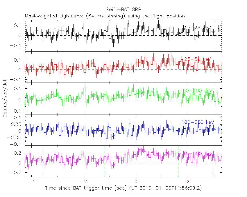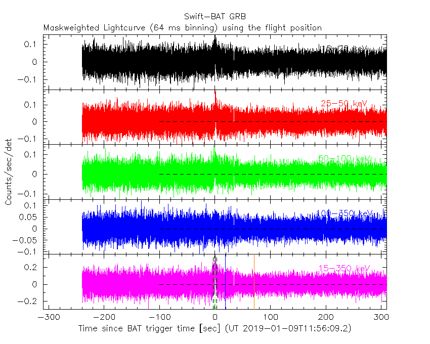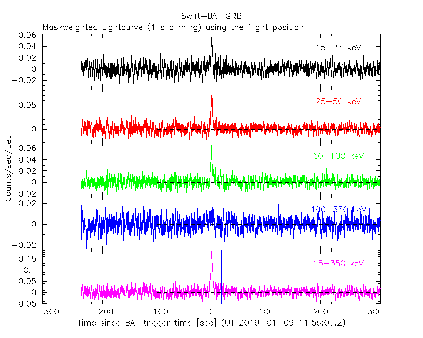 - 4) The verticle lines correspond to following: green dotted lines are T50 interval, black dotted lines are T90 interval, blue solid line(s) is a spacecraft slew start time, and orange solid line(s) is a spacecraft slew end time.