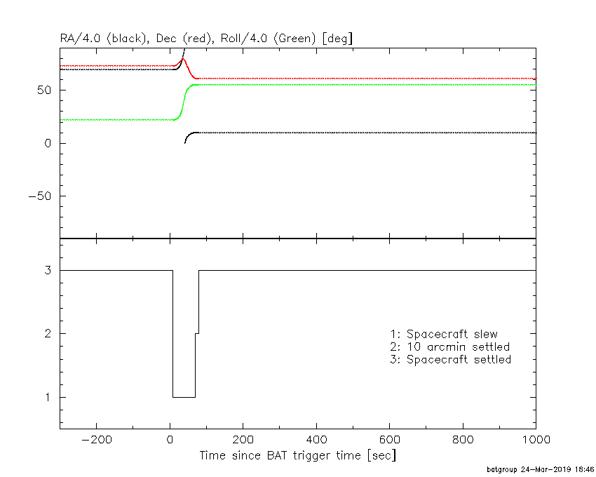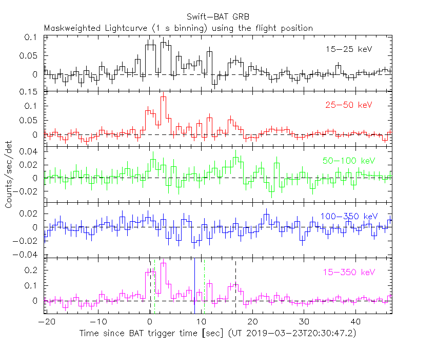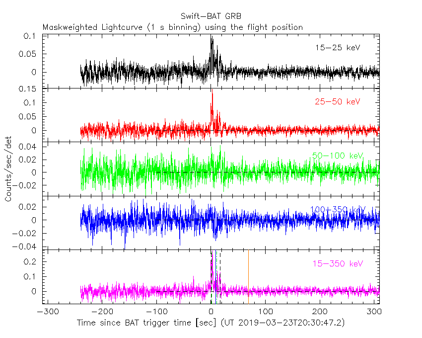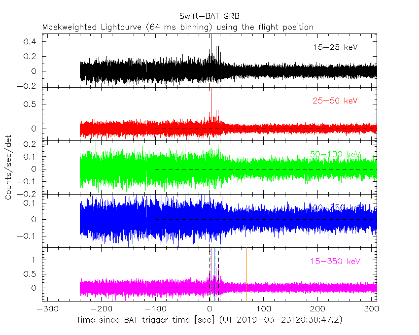- 5) The verticle lines correspond to following: green dotted lines are T50 interval, black dotted lines are T90 interval, blue solid line(s) is a spacecraft slew start time, and orange solid line(s) is a spacecraft slew end time.