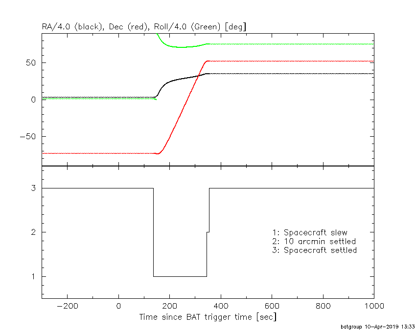 - 5) The verticle lines correspond to following: green dotted lines are T50 interval, black dotted lines are T90 interval, blue solid line(s) is a spacecraft slew start time, and orange solid line(s) is a spacecraft slew end time.