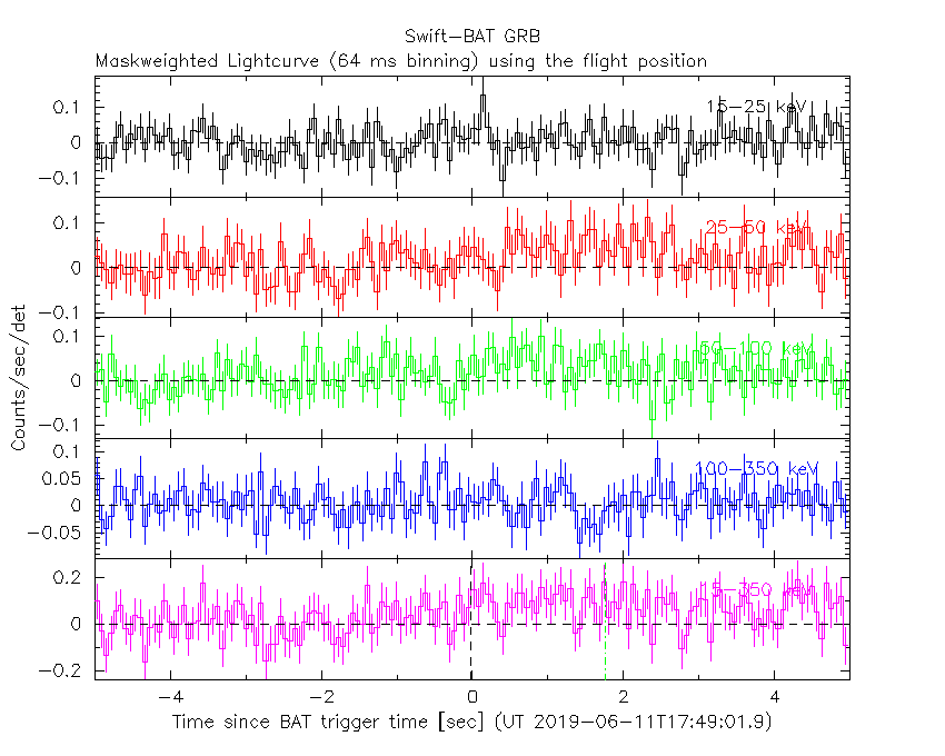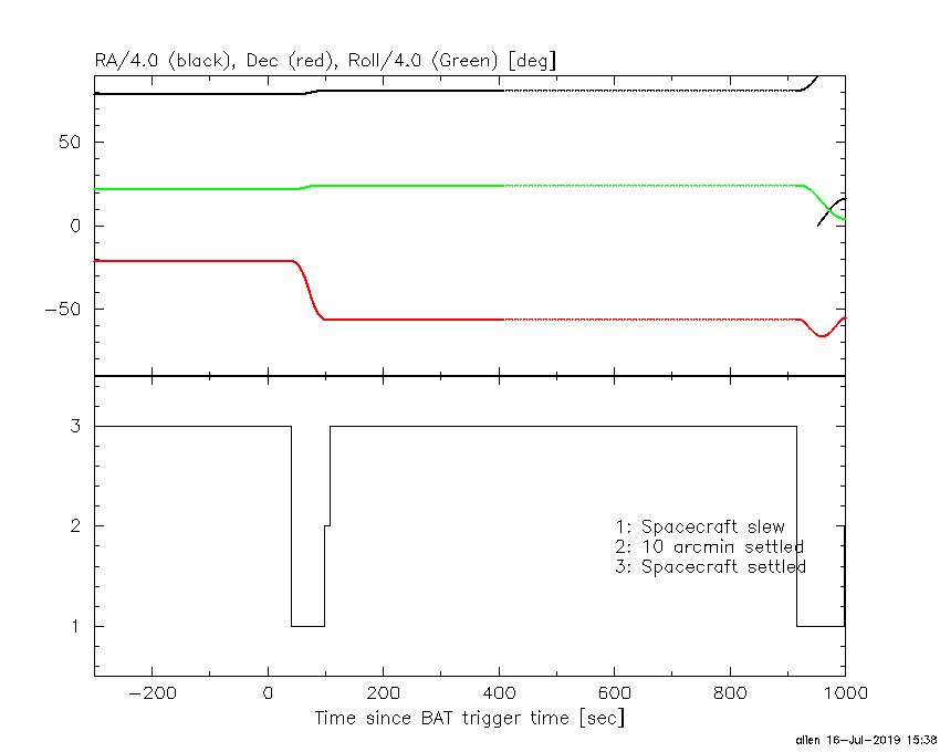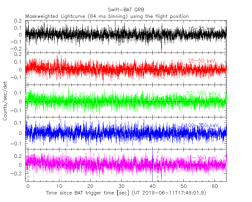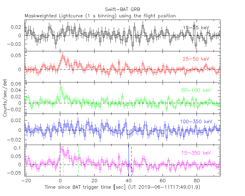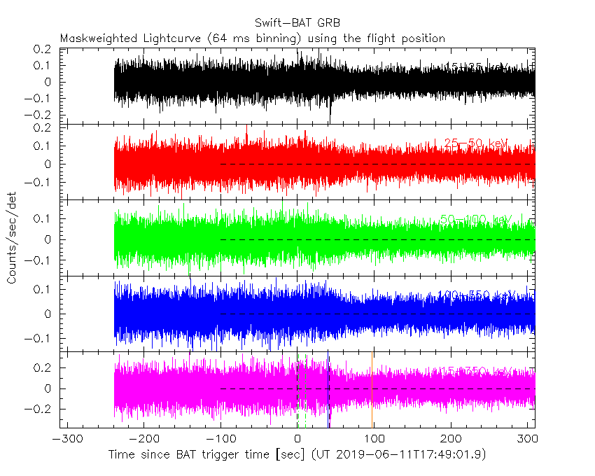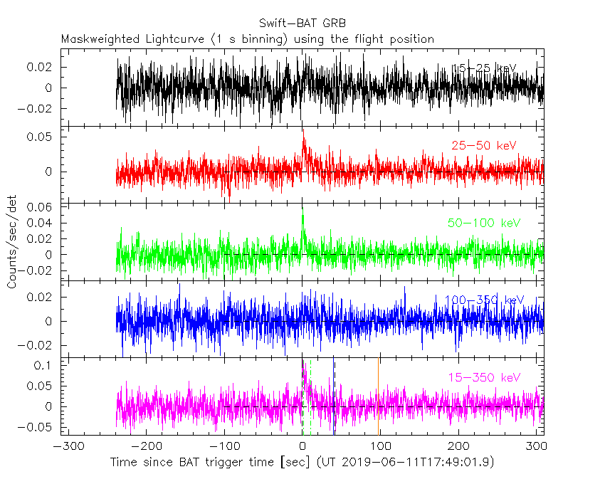 - 4) The verticle lines correspond to following: green dotted lines are T50 interval, black dotted lines are T90 interval, blue solid line(s) is a spacecraft slew start time, and orange solid line(s) is a spacecraft slew end time.
