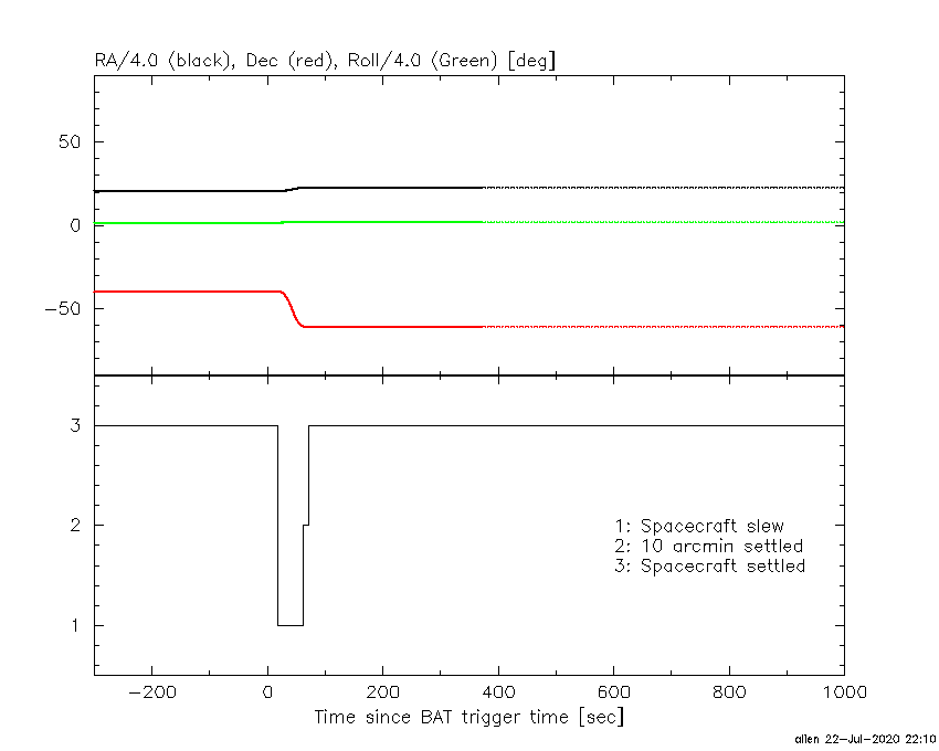 - 4) The verticle lines correspond to following: green dotted lines are T50 interval, black dotted lines are T90 interval, blue solid line(s) is a spacecraft slew start time, and orange solid line(s) is a spacecraft slew end time.