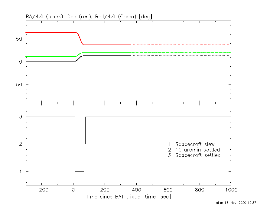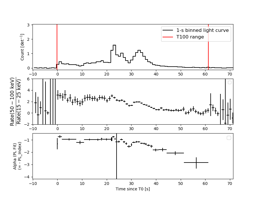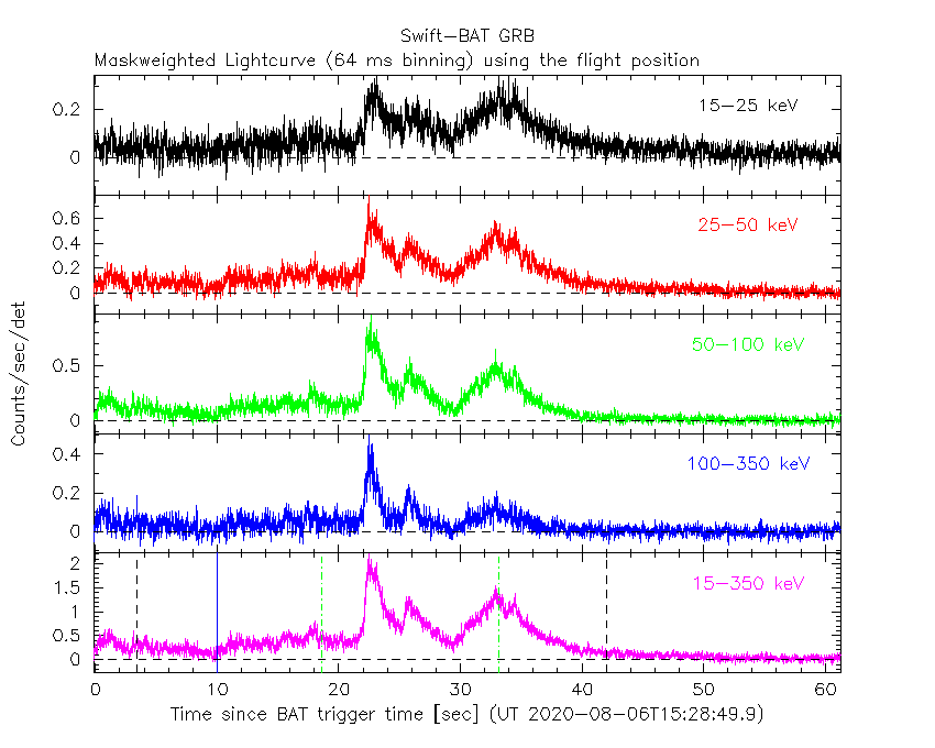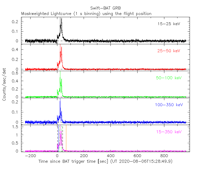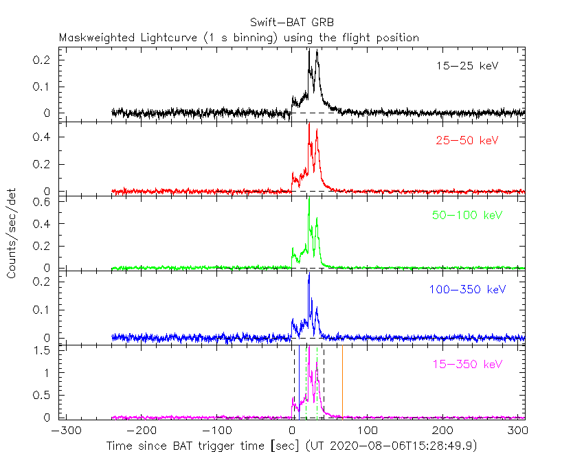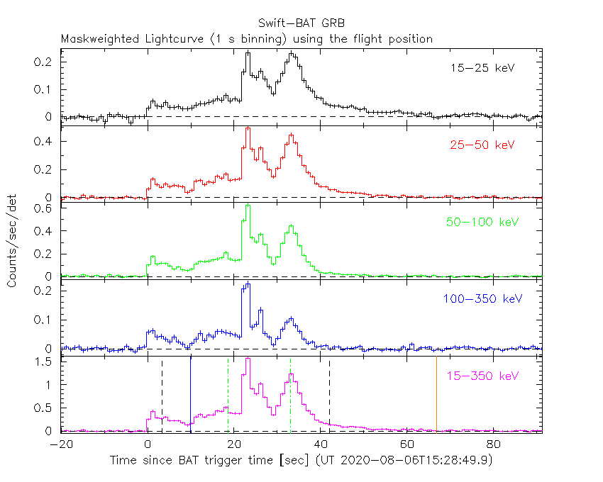 - 4) The verticle lines correspond to following: green dotted lines are T50 interval, black dotted lines are T90 interval, blue solid line(s) is a spacecraft slew start time, and orange solid line(s) is a spacecraft slew end time.