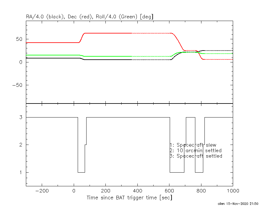 - 4) The verticle lines correspond to following: green dotted lines are T50 interval, black dotted lines are T90 interval, blue solid line(s) is a spacecraft slew start time, and orange solid line(s) is a spacecraft slew end time.