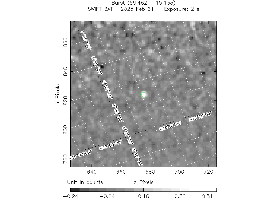 # RAcent DECcent POSerr Theta Phi Peak Cts SNR Name 59.4757 -15.1358 0.0156 40.2471 -59.5840 0.6253832 12.360 TRIG_01290305 Foreground time interval of the image: -0.220 1.844 (delta_t = 2.064 [sec]) Background time interval of the image: -194.491 -0.220 (delta_t = 194.271 [sec])