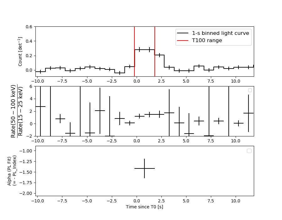 Time interval is from -0.220 sec. to 1.844 sec. Spectral model in power-law: ------------------------------------------------------------ Parameters : value lower 90% higher 90% Photon index: -1.41801 ( -0.22981 0.229011 ) Norm@50keV : 2.00056E-02 ( -0.00266355 0.00265496 ) ------------------------------------------------------------ #Fit statistic : Chi-Squared 45.64 using 59 bins. Reduced chi-squared = 0.800702 # Null hypothesis probability of 8.60e-01 with 57 degrees of freedom Photon flux (15-150 keV) in 2.064 sec: 2.44650 ( -0.33155 0.33247 ) ph/cm2/s Energy fluence (15-150 keV) : 3.97595e-07 ( -5.79303e-08 5.8379e-08 ) ergs/cm2