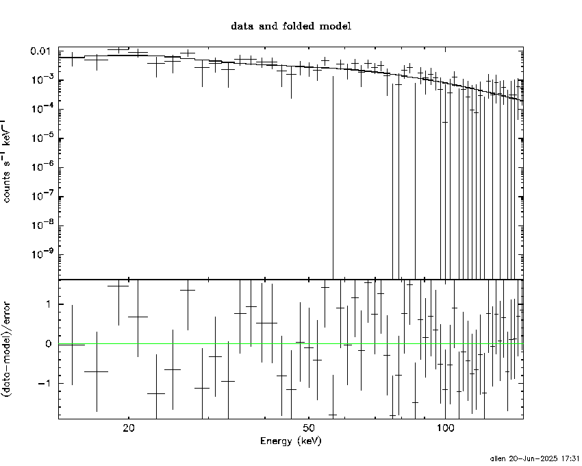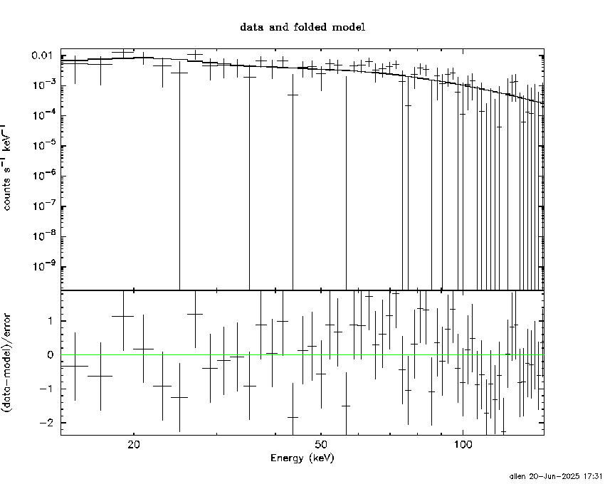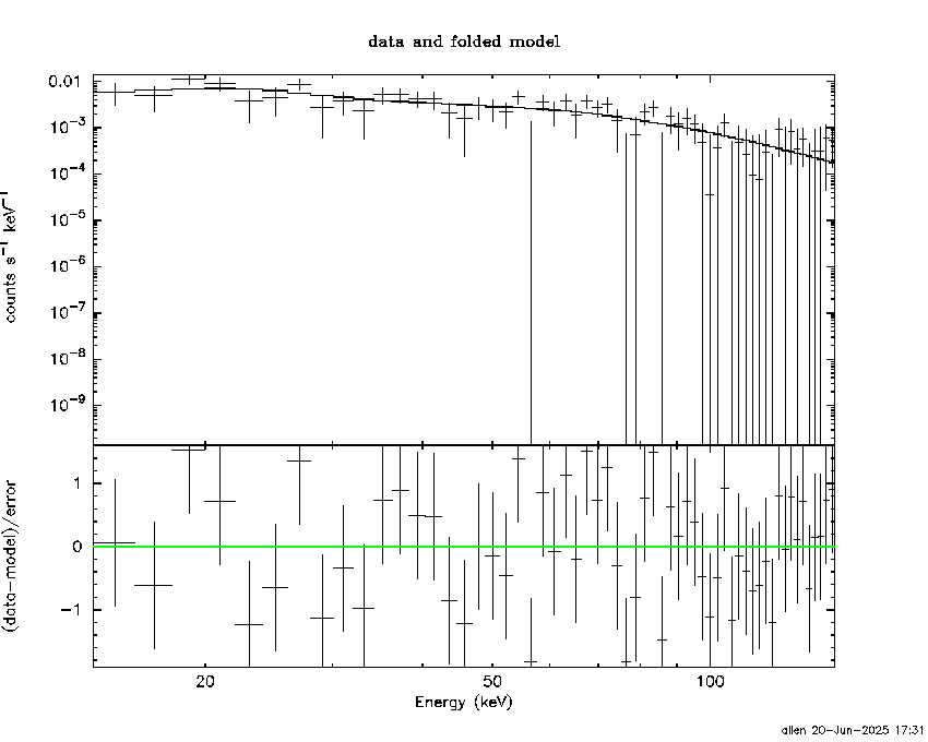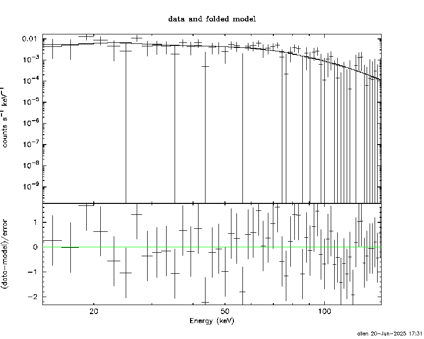 Time interval is from -0.220 sec. to 1.844 sec. Spectral model in the cutoff power-law: ------------------------------------------------------------ Parameters : value lower 90% higher 90% Photon index: -1.27291 ( -1.36152 0.998392 ) Epeak [keV] : 260.707 ( -266.328 -266.328 ) Norm@50keV : 2.35518E-02 ( -0.0194291 0.0458727 ) ------------------------------------------------------------ #Fit statistic : Chi-Squared 45.57 using 59 bins. Reduced chi-squared = 0.81375 # Null hypothesis probability of 8.39e-01 with 56 degrees of freedom Photon flux (15-150 keV) in 2.064 sec: 2.43319 ( -0.3423 0.33308 ) ph/cm2/s Energy fluence (15-150 keV) : 3.94511e-07 ( -6.14989e-08 5.96395e-08 ) ergs/cm2