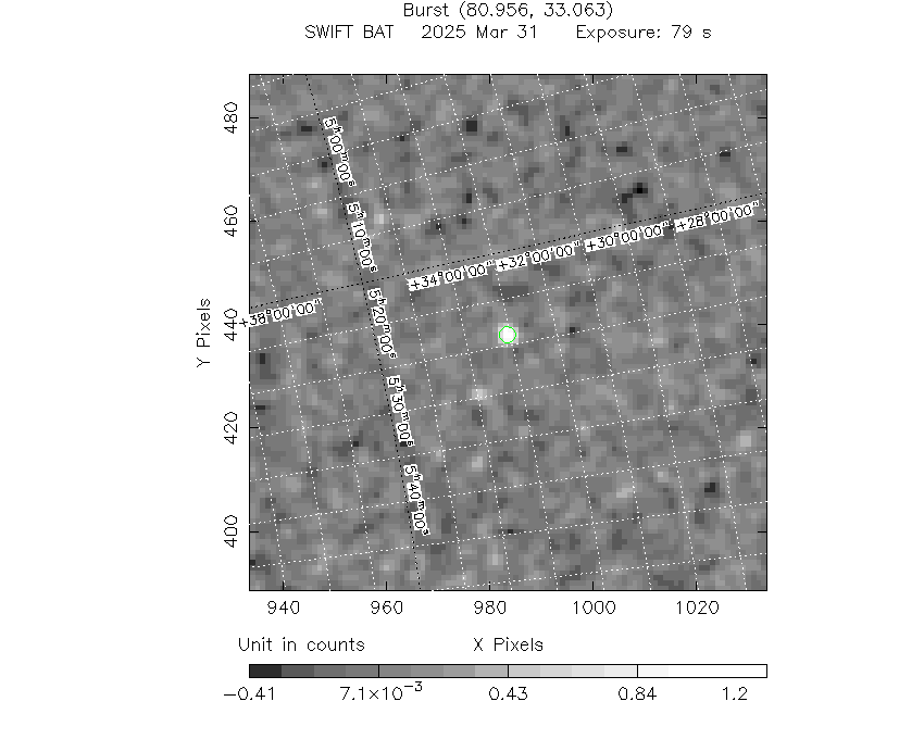 # RAcent DECcent POSerr Theta Phi Peak Cts SNR Name 80.9626 33.0676 0.0172 13.0893 159.6101 1.3543795 11.128 TRIG_01299967 Foreground time interval of the image: -12.588 66.668 (delta_t = 79.256 [sec]) Background time interval of the image: -239.000 -12.588 (delta_t = 226.412 [sec])