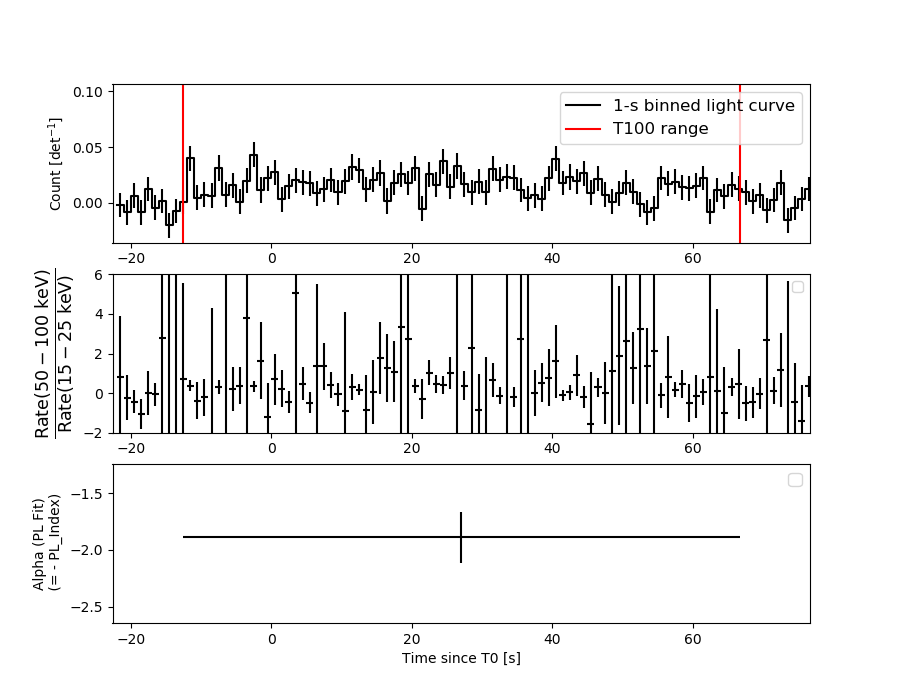 Time interval is from -3.192 sec. to -2.192 sec. Spectral model in power-law: ------------------------------------------------------------ Parameters : value lower 90% higher 90% Photon index: -1.33702 ( -0.990949 1.06244 ) Norm@50keV : 2.62305E-03 ( -0.00121554 0.00114955 ) ------------------------------------------------------------ #Fit statistic : Chi-Squared 59.02 using 59 bins. Reduced chi-squared = 1.03544 # Null hypothesis probability of 4.02e-01 with 57 degrees of freedom Photon flux (15-150 keV) in 1 sec: 0.315141 ( -0.315141 0.143784 ) ph/cm2/s Energy fluence (15-150 keV) : 2.57022e-08 ( -1.27062e-08 1.29648e-08 ) ergs/cm2