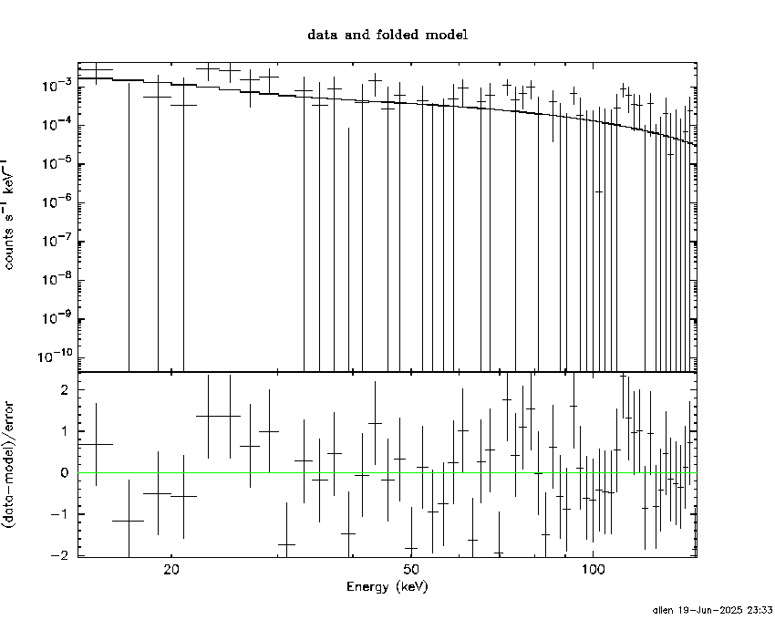Time interval is from -12.588 sec. to 66.668 sec. Spectral model in power-law: ------------------------------------------------------------ Parameters : value lower 90% higher 90% Photon index: -1.88284 ( -0.232184 0.220071 ) Norm@50keV : 9.04940E-04 ( -0.000141931 0.000138617 ) ------------------------------------------------------------ #Fit statistic : Chi-Squared 52.73 using 59 bins. Reduced chi-squared = 0.925088 # Null hypothesis probability of 6.36e-01 with 57 degrees of freedom Photon flux (15-150 keV) in 79.26 sec: 0.128941 ( -0.01613 0.01613 ) ph/cm2/s Energy fluence (15-150 keV) : 6.59484e-07 ( -1.00622e-07 1.03269e-07 ) ergs/cm2